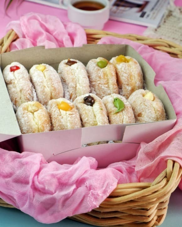 Bomboloni dengan varian isi rasa coklat, keju, susu, strawberry, bluberry, greentea, tiramisu, srikaya, pandan, taro, kacang hijau, kacang merah.